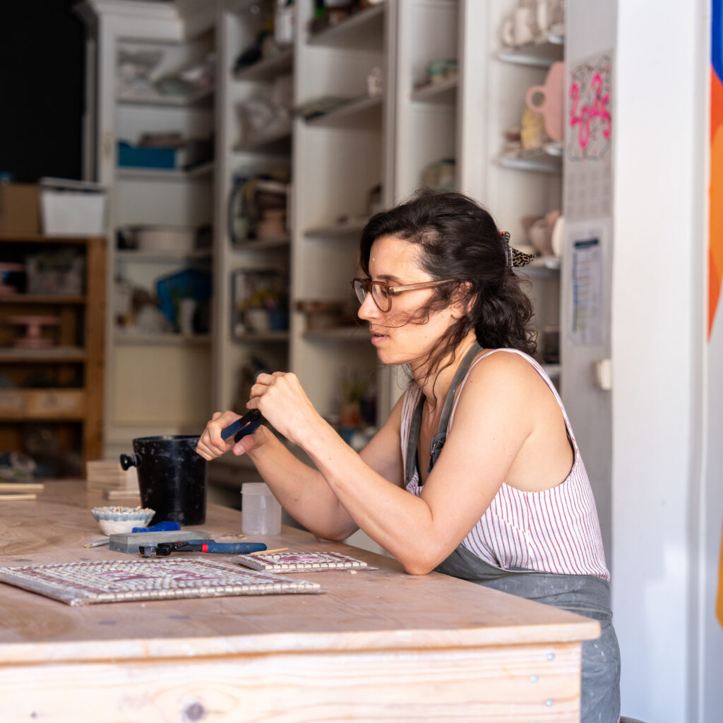 Mankenti, c’est celle qui apporte de la couleur dans l’atelier. Reine des engobes pendant les stages Céramique & Illustrations, elle réalise aussi à l’atelier ses célèbres pin’s. Manon embellit aussi l’atelier au sens propre : c’est elle qui a peint la superbe presque à l’effigie de Déméter dans l’atelier. Quand elle ne peint pas sur céramique, elle mélange un travail traditionnel à l’aquarelle à une approche digitale, cela lui permet de faire vibrer ses couleurs et d’avoir très peu de contraintes dans ses recherches artistiques.
